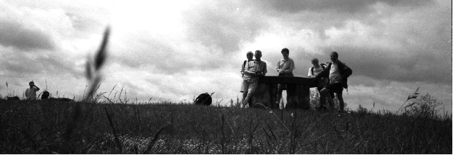 " Il était une fois, une compagnie de randonneurs (19 au total) qui, après s'être émerveillé devant les œuvres sculpturales du Chemin des Poètes, se trouva, au beau milieu des bois, pourvu de moyens d'orientation divergents excluant toute situation exacte sur le terrain. Des ondes malsaines s'étaient emparées de nous. De nouveaux chemins se créaient, de nouvelles lignes à haute tension nous trompaient, les appareils d'orientation indiquaient deux " Nord " différents. Incroyable, tout était contre nous, nous devions envisager le pire, la survie de tous, les cabanes pour la nuit, la restriction et le partage des moyens de subsistance, c'était terrible ".